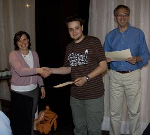 Sergio Escalera, coauthor (with Alicia Fornés, Josep Lladós, Gemma Sánchez, Petia Radeva, and Oriol Pujol) of the awarded paper, "Handwritten Symbol Recognition by a Boosted Blurred Shape Model with Error Correction", accepts the Best Paper Prize from Nicolas Perez de la Blanca, current president of AERFAI, and Ana Maria Mendonça, organizer of the 4th edition of IbPRIA in Porto, Portugal next 2009. |