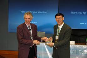 Prof. Max A. Viergever receiving a souvenir from General Chiar Prof. David Zhang after delivering his keynote talk. |