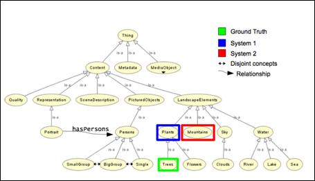 Figure 1: Part of the hierarchy of the ontology and their relations. Wikipedia Image Retrieval The Wikipedia image retrieval task distributed a collection of 150,000 images uploaded by Wikipedia users. The textual descriptions of the images in English were also distributed. Topics contained at least one image and a short query text. Topic generation, as well as the assessment for the creation of ground truth, were partly done collaboratively with the participants of the task. (See [4]). Robot Vision Task The robot vision task was also new in 2009. The goal of the task was to learn places where a robot had taken pictures and then re-identify the place later when the robot passed again. The challenges include changes in lighting and the placement of the furniture and small modifications, for example people being temporarily in the room (Figure 2). (See [5]).