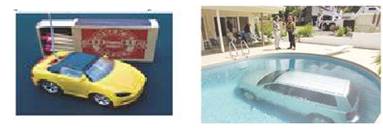 The integrated model is followed by the question: is context really needed? If we have a small number of classes, objects are clearly defined by their local appearance. But, when we have many object classes, it gets more complicated to detect objects efficiently. Moreover, context is important to figure out not only what the object is but also to define what an unexpected event is. An example is shown in Figure 5. On the left, the context changes the interpretation of the object—the car is only a toy that we cannot drive. On the right, a car in the swimming pool is an unexpected event.