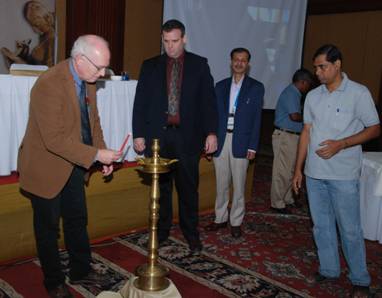 During the inaugural ceremony for ICPR2010, wicks of a lamp-cluster were ignited for an auspicious beginning to the conference. Here (from left) are Prof L. Schomaker (candle in hand), Prof D. Doermann, Prof. B Chaudhuri, and Mr P Chattaraj. In the background is Indian Statistical Institute Dirctor Prof Bimal Roy. |
