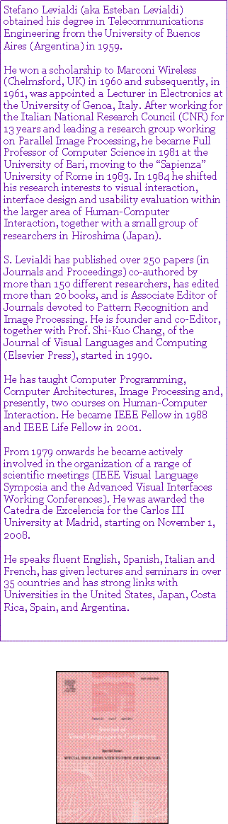 I initially became interested in the various aspects of cybernetics (machines that could learn, reason and recognize patterns) and later on in pictures and digital images…it seemed a different world, and this was at the end of the 50’s when I had recently graduated in Telecommunication Engineering at Buenos Aires (Argentina). I managed to obtain a scholarship from Marconi Wireless, located at Chelmsford (Essex, U.K.) in 1960. I worked on different kinds of communication equipment but was neither happy about the kind of work nor of its corresponding salary! (Being a foreigner my salary was half of what the locals earned). For these reasons I tried something else, having interviews with Cambridge Instruments, Pye Electronics, Philips, etc. but the jobs were similar even if they had different economical conditions. By pure chance, I spent Christmas in Italy, in Genoa, where I met a university group that was doing research in Pattern Recognition developing a machine called PAPA, that could even learn, after a short training period, a given class of patterns, like O’s and A’s. I spent five years at the Institute of Physics, University of Genoa (1961/65), and, since my paper production was low (few papers in five years) I was told to emigrate, which I did, to another group doing research on Learning Machines, located in Naples at the Institute of Theoretical Physics, University of Naples, where I spent fifteen years designing and building machines for parallel image processing. The group in Naples had formalized a set of mathematical equations which were called Neural Network Equations that were supposed to formally describe the neural synapses active in the human brain. In 1968 the Laboratory of Cybernetics was started near Naples and I became the Head of the Image Processing Group during thirteen years, together with other researchers, still active today. The main activity was the design of parallel image algorithms (shrinking, skeletons, medial axis transform, etc.) which would outperform the standard sequential computer ones. Over 100 papers were published, and we had many visitors staying and cooperating with us. We also travelled very much since the Italian National Research Council generously provided us with funding to visit practically any country we wanted. In 1981, I won the Chair of Computer Science and moved to Bari University on the eastern coast of Italy, where I remained for two years until finally arriving to Rome at Sapienza University where I designed the new curriculum in Computer Science that started in 1989 after six hard years of discussion (whether to start at the Engineering Faculty or at the Sciences Faculty). At present , Computer Science reunited both groups and belongs to a Faculty of Information Sciences, together with Statistics and Electronics. I finaylly retired in November 2010 after having worked 49 years at different universities. For my work on Parallel Image Processing I was awarded the IEEE Fellowship (1988), for my overall work in Image Processing I became an IAPR Fellow (1994), and next a VL/HCC Fellow (2008) for my activity in Human/Computer Interaction and Visual Languages. Finally, for my general activity I received the KSI Fellowship in 2011 (2011) at an International Conference. I have wildly travelled….visiting over 45 countries where I have given talks and started collaborations with local researchers. I have published over 250 papers plus a book (2011), together with other two authors, (3C Vision: cues, contexts and channels). My teaching duties at the different universities included the following subjects: Electronics Laboratory, Computer Architectures, Image Processing, Human-Computer Interaction (I and II), all aimed at Computer Science students. Finally, let me mention the Journal of Visual Languages and Computing (Elsevier Press) that I started in 1990 (together with Prof. S.K. Chang) and the over 50 International meetings that I have organized along the years, the last one will take place in Capri (near Naples) in May 2012, called Advanced Visual Interfaces, being the 12th edition of the series. |